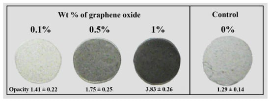 Film composite structures formed by calcium alginate and graphene oxide (GO). Increasing concentrations of GO in the range of 0–1% w/w. The opacity is presented as mean ± standard deviation in the base part of the samples. Reprinted with permission from Elsevier [71].