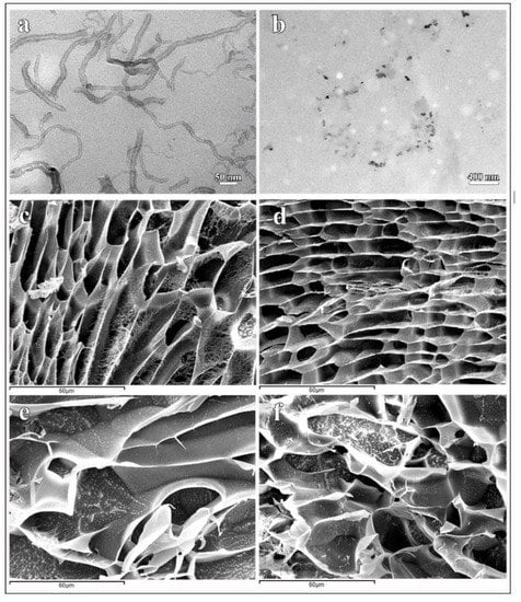 Transmission electron microscopy (TEM) captures of carbon nanofibers (CNFs) (a) and ultrathin sections of calcium-cross-linked alginate with CNFs at 1% w/w ratio (b); cryo-scanning electron microscopy (cryoSEM) of calcium-crosslinked alginate films, neat (c,e) and with CNFs (d,f), hydrated at 26 ± 0.5 °C and 37 ± 0.5 °C for 1 day, respectively. Reprinted with permission from Elsevier [68].