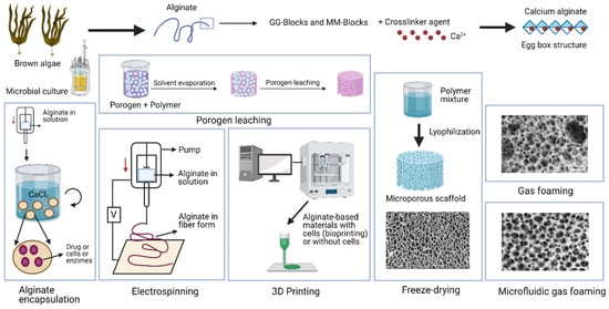 Alginate has established itself as an excellent biodegradable, renewable, and biocompatible material with non-immunogenicity and easy gelation capacity [1,2]. This biopolymer can be produced from brown algae or microorganism culture [3,4]. Alginate is a U.S. FDA-approved product currently used in several medical applications, such as thickening stabilizing agents for dental impression materials and wound healing treatments in gel form [5]. Alginate currently possesses an immense number of industrial applications in a wide range of fields, such as biotechnology, bioengineering, biomedicine, and clinical applications, the pharmaceutical industry, chemical, textile, packaging and construction industry, food and drinks, aquaculture, dentistry, paper industry, arts and crafts, and the leisure industry (Table 1).