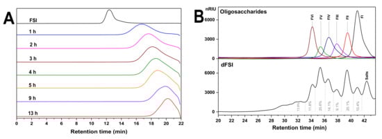 Mild acid hydrolysis is the most commonly used method for the cleavage of glycosidic bonds of complex polysaccharides []. Under 80 °C, the results showed that the retention time (Rt) of FSI was detected to change from 12 min to 17.628 min on a Shodex OHpak SB-804 HQ column after 2 h, while under 100 °C, after 2 h, Rt of the hydrolysate was detected at 20.982 min (Figure S1). Obviously, the mild hydrolysis rate of FSI under 100 °C was faster than under 80 °C and was not easy to control. Thus, FSI was depolymerized at 80 °C and dFSI was obtained. High-performance gel permeation chromatography (HPGPC) showed that its molecular weight was significantly reduced as the time course prolonged (Figure 1A). After reaching the appropriate molecular weight, 6 M NaOH was added to terminate the reaction and the hydrolysates were desalted on a Sephadex G-25 column, then freeze-dried to produce 1.4 g dFSI with a yield of 78%.