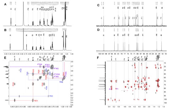 For the one-dimensional and two-dimensional NMR analysis, about 3 mg of each oligosaccharide (FI–FVI) was dissolved in 1.0 mL of D2O (99.9%) and lyophilized three times. The final powder was dissolved in 500 μL of D2O (99.9%) in a 5 mm tube. The 1D NMR (1H/13C spectra) and 2D correlation spectra including 1H–1H COSY, TOCSY and ROESY, 1H-13C HSQC and HMBC spectra of FI, FII, FIII, FIV, and FVI were recorded on a Bruker AVANCE III 600 MHz spectrometer at 298 K with sufficient acquisition time. In particular, the 1D/2D NMR spectra of FV were acquired on a Bruker AVANCE III 800 MHz spectrometer (Bruker Biospin, Rheinstetten, Germany). All spectra were analyzed with MestReNova software (Mestrelab Research SL, Santiago de Compostela, Spain). The 1H and 13C chemical shifts were displayed relative to internal 3- (trimethylsilyl) propionic-2,2,3,3-d4 acid sodium salt (TSP) at 0.00 ppm.