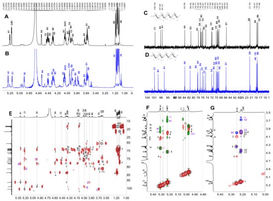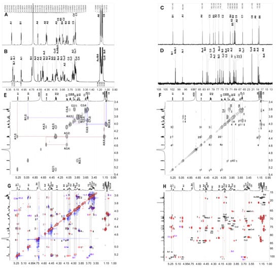 The 1H (A,B) and 13C (C,D) spectra of FIII and FIV, 1H–1H COSY (E) and ROESY (F) of FIII; the overlapped 1H–1H COSY (gray), TOCSY (red) and ROESY (blue) spectra (G) of FIV; and the overlapped 1H-13C HSQC (gray) and 1H-13C HMBC (red) spectra (H).