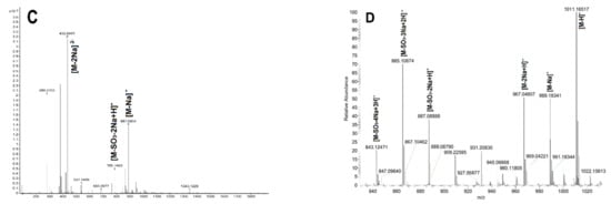 Similarly, FII showed clear signals in its 1H and 13C NMR spectra (Figure 2B,D). Starting from the unambiguous signals at 5.332 ppm, one spin system was found in the 1H–1H COSY spectrum (Figure S4A), indicating that it was a fucose unit. Another spin–spin system from signals at 3.71 and 3.69 ppm was observed. According to the integration of proton signals in the 1H NMR spectrum and the total number of carbons in the 13C NMR (Figure 2B,D), it could be deduced to be a disaccharide. The 1H and 13C chemical shifts of FII can be readily assigned and are shown in Table 1. Compared with the non-sulfated fucose residues, the obvious downfield resonances of the H-2 signal (δ 4.472 ppm) and H-4 signal (δ 4.706 ppm) of the non-reducing end residue (I) indicated this fucose was sulfated at both C-2 and C-4 positions, while the reducing end was L-Fuc-ol. The glycosidic bond was clarified as 1,3 according to the correlation peaks in 1H-1H ROESY and 1H-13C HMBC (Figure 2G,H). Additionally, the molecular formula was determined to be C12H22Na2O15S2 by negative ESI-MS peaks at m/z = 493.0324 assigned as [M-Na]− (calculated as 493.0298), 471.0502 assigned as [M-2Na+H]- (calculated as 471.0478), and 391.0933 assigned as [M-SO3-2Na+H]- (calculated as 391.0910) (Figure S4B). In summary, its structure can be stated as L-Fuc2S4S-α1,3-L-Fuc-ol (Scheme 1).