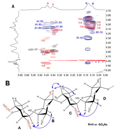 Partial overlapped spectra (A) of 1H-1H COSY (gray), ROESY (blue) and TOCSY (red) of depolymerized product (dFSI′) and possible cross-peaks from H-1 in ROESY marked by blue arrows (B). The capital letters A, B, C and D represent Fuc2S4S, Fuc(2S), Fuc2S and Fuc, respectively.