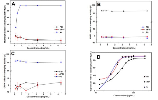 Scavenging effect of FSI and dFSI′ on hydroxyl radicals (A), ABTS radicals (B), DPPH radicals (C) and superoxide radicals (D), respectively. (n = 3).