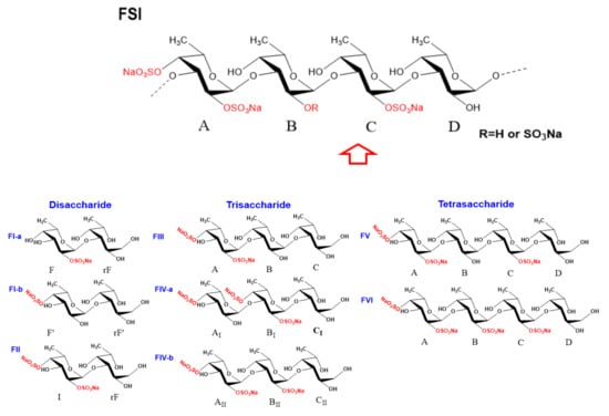 In summary, our previous report suggested that the basic structural unit of FSI was [-L-Fuc2S4S-α1,4-L-Fuc-α1,3-L-Fuc2S-α1,4-L-Fuc-α1,3-]n, which was deduced by analysis of the 1H–1H ROESY spectrum of the low-molecular-weight product obtained by peroxide depolymerization. In the present study, through comprehensive analysis of the chemical structure of oligosaccharide fragments and using a bottom-up strategy, native FSI was proven to be composed of the main tetrasaccharide repeating unit with a structure sequence of [-L-Fu2S4S-α1,3-L-Fuc(2S)-α1,3-L-Fuc2S-α1,3-L-Fuc-α1,3-].
