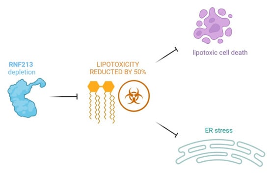 The lipid accumulation interferes with normal cellular and tissue functions, causing lipotoxicity, which seems to be one of the causes of many metabolic diseases [36,37]. Saturated fatty acids are implicated in several mechanisms, including incorporation into membrane lipids and storage in lipid droplets, by acting as protein modifiers or mitochondrial oxidation. Palmitate (C16: 0) is particularly toxic for cells, since high concentrations of palmitate induce apoptosis [38]. More recently, Piccolis et al., conducted studies on palmitate-induced toxicity. An excess of palmitate is incorporated into a wide variety of lipids, and the accumulation of saturated glycerolipids in the ER triggers the prolonged activation of the IRE1 pathway of the UPR [39,40]. The depletion of RNF213 was identified as a protection mechanism against palmitate-induced lipotoxicity, reducing the cellular toxicity by 50%. Furthermore, RNF213 knockdown also lessened palmitate-induced cell death in different cell types. The most surprising finding is that the depletion of RNF213 almost normalized the cellular lipidome during exposure to palmitate, abrogating the accumulation of di-saturated glycerophospholipids. Measuring the incorporation of radiolabeled palmitate into lipids, it seems that RNF213 knockdown did not alter the total palmitate incorporation but promoted the partitioning of the substrate toward triglycerides. Although the mechanism remains to be determined, RNF213 is clearly a modulator of lipotoxicity from saturated fatty acids through a mechanism that has an important effect on a cell’s ability to store lipids in droplets, ubiquitous organelles specialized for neutral lipid storage (LDs) (Figure 1).