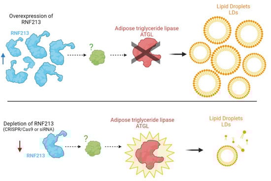A possible link between RNF213 and lipid droplet (LD) stability. An overexpression of RNF213 increases the number and the covered area of LDs, while RNF213 depletion significantly reduced the abundance of LDs (siRNA, small interfering RNA; ATGL, adipose triglyceride lipase).