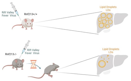 The RNF213 gene may also impact the resistance to infectious diseases such as Rift Valley Fever (RVF), an emerging viral zoonosis affecting ruminants and humans [50]. Evidence from experimental models has demonstrated the importance of genetic host factors in determining the RVF severity in mice. The authors narrowed down the critical interval to a 530 kb region containing five protein-coding genes, among which RNF213 emerged as a potential candidate. They generated Rnf213-deficient mice by CRISPR/CAS9 and showed that they were significantly more susceptible to RVF than the control mice. The STRING Mus musculus database analysis revealed that murine RNF213 formed a highly interconnected network with UBA7, USP18, PARP14, IFIT3, IRF7, RSAD2, STAT1, IGTP, MX2, RTP4, OASL2, IRGM2, LGALS3BP and OAS2 proteins. Seven of these proteins were associated with the Gene Ontology (GO) categories ’innate immune response’, six with the ’immune effector process’ and/or ’response to other organism’, five with ’defense response to virus’, three with ’negative regulation of viral process’ and two with ’response to type I interferon’. These numerous interactions with innate immunity genes suggested a role of RNF213 in response to infection [50]. Homozygous Rnf213-deficient mice (referred to as Rnf213tm3/tm3) did not show any visible phenotype under a conventional environment. After intraperitoneal injection of the RVF virus (RVFV), the survival time in lethally infected mice was significantly shorter in Rnf213tm3/tm3 than in Rnf213+/+. These results indicated that RNF213 gene delays the fatal outcome of RVFV infection. In humans, the primary site of RVFV replication is in the liver, together with LD accumulation [51]. A major consequence of RVFV infection in mice is the overwhelming infection of hepatocytes resulting in early-onset death for severe hepatitis [52,53]. It has been observed that the hepatocytes store up cytoplasmic LDs persisting during liver regeneration in the surviving mice [54]. It is therefore possible that RNF213 influences the resistance to RVFV infection through a major role in lipid metabolism [50] (Figure 3).