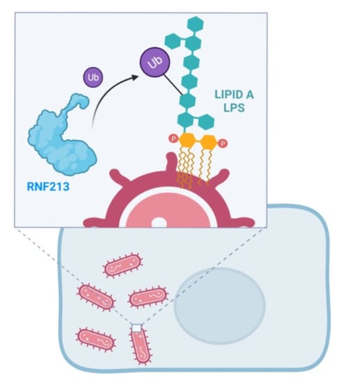 - Otten, E.G.; Werner, E.; Crespillo-Casado, A.; Boyle, K.B.; Dharamdasani, V.; Pathe, C.; Santhanam, B.; Randow, F. Ubiquitylation of lipopolysaccharide by RNF213 during bacterial infection. Nature 2021, 594, 111–116. [Google Scholar] [CrossRef]