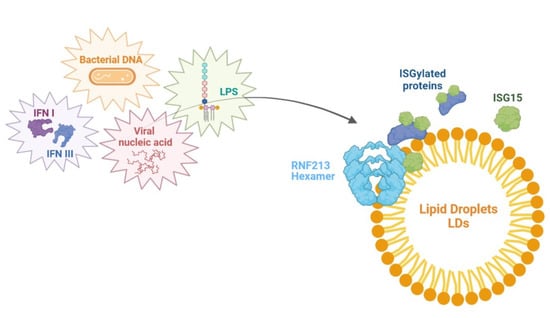 RNF213 has been described as an ISG15 interactor and cellular sensor of ISGylated proteins [34]. ISG15 is an interferon-stimulated and Ub-like protein that, in a process known as ISGylation, conjugates an immunity-related modification, counteracting microbial infection [59,60,61,62,63]. Once upregulated by type I and III interferons, viral nucleic acids, bacterial DNA and LPS, ISG15 is able to exert potent antiviral effects both in vitro and in vivo [64,65,66]. It has also been described as an ISG15 antibacterial activity against intracellular bacterial and eukaryotic pathogens [64,67,68]. Currently, the mechanisms by which ISG15 modification is perceived and how it protects against microbial infections have not yet been clarified. A supposed model is based on the localization of the ISG15 E3 ligase (HERC5) at the ribosome site where the proteins are co-translationally modified by ISG15 during infection, thus hampering with the function of newly translated viral proteins [69]. Differently from ubiquitin, ISG15 exerts an antimicrobial role by also conjugating to target substrates through noncovalent interactions or acting as a secreted cytokine. For instance, free ISG15 is referred to interact in a noncovalent way with HIF1α, avoiding its dimerization and downstream signaling [35]. For this reason, in order to identify and map the noncovalent ISG15 protein–protein interactions, Thery et al. developed the MS-based approach named Virotrap, a virus-like particle trapping technology that allows the capture of protein complexes within virus-like particles (VLPs) budding from mammalian cells. Thanks to this technology, they mapped the noncovalent interactome of ISG15 in human cells. RNF213 has been identified as the most enriched protein in the ISG15 VLPs, requiring both the N- and C-terminal domains to selectively interact with ISG15. This evidence highlighted the capability of RNF213 to interact with and bind ISGylated proteins, recruiting them to LDs. Monomeric RNF213 is directly recruited from the cytosol on the surface of LDs, where its oligomerization in a hexamer is driven by ATP binding. RNF213 oligomerization and translocation to LDs may serve for the creation of a binding platform for ISG15 and, potentially, multiple ISGylated proteins [34]. Thery et al. demonstrated that the increasing expression of RNF213 is strictly associated with lower viral infection levels in cultured cells. Conversely, the reduced RNF213 expression levels promoted in vitro infection with different viruses. Compared to the antiviral activity, the antimicrobial effect of RNF213 was more marked and subjected to ISG15. Taken together, these results emphasized the role of RNF213 in the innate cellular immune response and pointed out a functional association between ISG15 and RNF213. As far as the antimicrobial activity reported in vivo, it is likely that the overexpression of RNF213 prior to infection gives rise to the innate defense response (Figure 5).