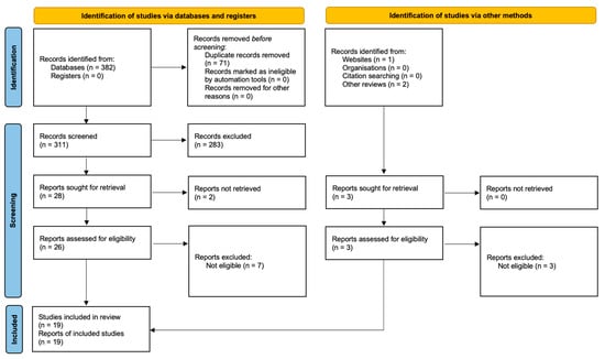 In the search for clinical trials (Figure 2), we identified 382 records through database searching. After removing 71 duplicates, we screened the title and abstracts of 311 articles, and 26 full texts based on our eligibility criteria. We also identified and screened three records from other reviews and websites. We ultimately selected 19 observational studies (1119 participants) for inclusion in our analysis.