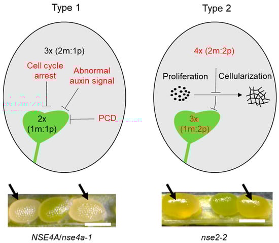 Seed formation starts with double fertilization, where one sperm nucleus fuses with the egg cell nucleus and the second sperm nucleus fuses with the central cell nucleus, giving rise to a diploid embryo and triploid endosperm, respectively []. Whereas the embryo represents a new plant generation, the functions of endosperm are manifold and include nourishing the embryo, sensing compatibility of the parental genomes, and, in some species, providing energy during germination. Endosperm development starts with several rounds of cell division without cell wall formation (syncytium). Several days after fertilization, endosperm cellularizes; this step is critical for successful seed development. Normal endosperm development and cellularization require a balanced dosage of maternal (m) and paternal (p) genomes, which is, by default, defined as a 2m:1p ratio []. Early studies in Arabidopsis revealed a class of mutants with unusually large seeds, disrupted endosperm cellularization, and arrested embryo development []. Genes underlying this phenotype were called TITAN, and some were mapped to subunits of cohesin and condensin complexes [,]. The presence of giant nuclei in their endosperm indicated problems in cell division. Recently, defects in seed development were described for the mutants in the SMC5/6 complex. Although there is a resemblance with the titan seeds, we propose that the SMC5/6 complex mutants display not one but at least two principal seed phenotypes (Type 1 and 2), differing as to their origin (Figure 2; Table 1).