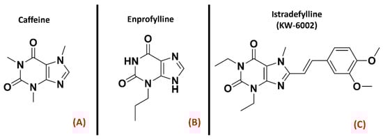 The chemical structures of the non-selective adenosine receptors antagonistscaffeine (A) and Enprofylline (B), and the selective A2AAR antagonist Istradefylline (C).