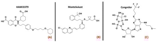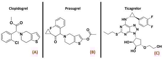 Jacobson et al. recently highlighted the proinflammatory effect of P2Y agonists, reporting that antagonizing this class of GPCRs could be considered a way of treating inflammatory conditions []. Even if inhibitors of the P2Y12 isoform are already marketed as antiplatelet drugs (e.g., Clopidogrel, Prasugrel, Ticagrelor, all represented in Figure 4), Jacobson et al. pointed out that there is a lack of selective and versatile P2Y ligands for each subtype, meaning thatthe drug discovery process is still very active in this specific field.
