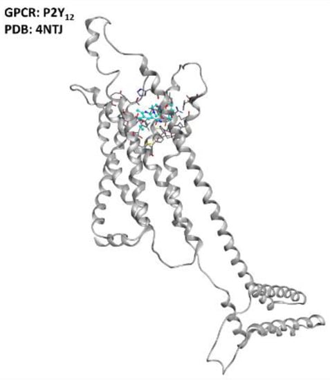 Representation of the structure of the P2Y12 receptor (sourced from the Protein Data Bank, PDB code: 4NTJ [], method: X-ray diffraction, resolution: 2.62 Å). The image was created and rendered with MOE.