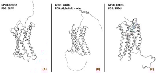 Several scientific works have reportedan increase in circulating chemokines and cytokines in ALS patients, as recently detailed by Liu et al. [], and the upregulation of chemokine receptors CXCR3, CXCR4, and CCR2 wasalso highlighted in the pathology of interest by Perner et al. [], whoalso proposed CXCR3 and its ligands as possible therapeutic targets for ALS. These scientific works converge in addressing chemokine receptor modulation as a possibility for ALS treatment, focusing on the antagonism of certain isoforms.The three-dimensional structures of CXCR2, CXCR3, and CXCR4 are represented in Figure 7.