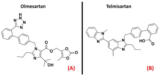 The chemical structures of the AT1 antagonists Olmesartan (A) and Telmisartan (B).