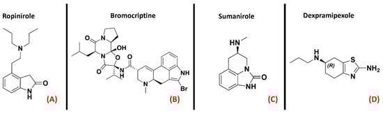 Fujimori et al. showed how the treatment with Ropinirole (Figure 10, panel A), an agonist for receptors D2R, D3R, and D4R mainly used for Parkinson’s disease, has neuroprotective effects in ALS models []. Additionally, D2R agonists such as Bromocriptine and Sumanirole(both represented in Figure 10, panels B and C, respectively) were tested by Huang et al., whoreportedthat the final effect of such activity on ALS models was an increase in motor neuron survival []. Another agonist for the “D2-like family” of dopamine receptors is the R(+) enantiomer of the Parkinson’s disease drug Pramipexole, known as Dexpramipexole (Figure 10, panel D).