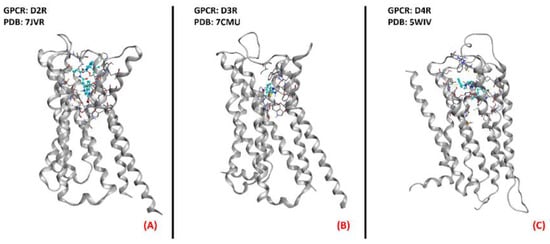 Representation of the three-dimensional structures of the dopamine receptors thatcould be considered for ALS treatment. (A) D2R (sourced the Protein Data Bank, PDB code: 7JVR [], method: cryo-EM, resolution: 2.80 Å), (B) D3R (sourced from the Protein Data Bank, PDB code: 7CMU [], method: cryo-EM, resolution: 3.00 Å), and (C) D4R (sourced from the Protein Data Bank, PDB code: 5WIV [], method: X-ray diffraction, resolution: 2.14 Å). All of the images were created and rendered with MOE.