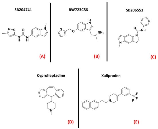 The chemical structures of the serotonin receptor modulators are treated in this review. The selective 5-HT2B antagonist SB204741 (A), the 5-HT2B agonist BW723C86 (B). (C) Structure of the 5-HT2B/C mixed inverse agonistSB206553; (D) chemical structure of Cyproheptadine, a non-selective mixed serotonin receptor antagonist (which is an inverse agonist of 5-HT2B). (E) Structureof the 5-HT1A receptor agonist Xaliproden.