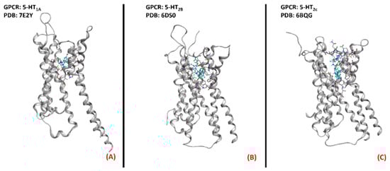 Despite the promising outcomes of the prior experiments [], no effective slowing down in the progression of the pathology was evidenced. Even if some limitations have been encountered in serotoninergic modulation for motor neuron disease, the 5-HT receptorshave been demonstrated to be targets of relevance in the ALS scenario. The three-dimensional structures of 5-HT1A, 5-HT2B, and 5-HT2C are represented in Figure 13.