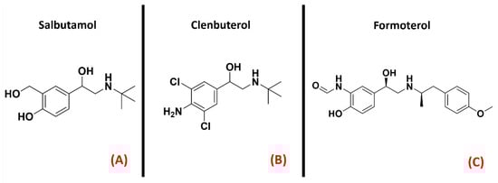 The chemical structures of the adrenergic β2 receptor agonists Salbutamol (A), Clenbuterol (B), and Formoterol (C).