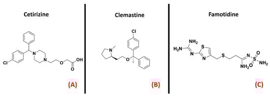The chemical structures of the H1 receptor antagonists Cetirizine (A) and Clemastine (B). The H2 receptor antagonist Famotidine is also reported (C).