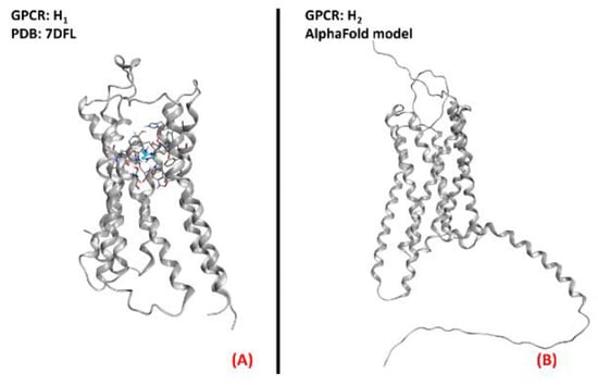 Representation of the three-dimensional structures of the histamine receptors that could be considered for ALS treatment. (A) The H1 receptor (sourced from the Protein Data Bank, PDB code: 7DFL [], method: cryo-EM, resolution: 3.30 Å) and (B) the H2 receptor (with no experimentally resolved structure available, the model sourced from the AlphaFold [] database is presented).The images were created and rendered with MOE. The H3 and H4 receptors both lack experimentally resolved structures, but their AlphaFold models are available.