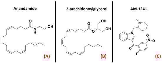 The chemical structures of the endogenous CB1 and CB2 receptors agonists anandamide (A) and 2-arachidonoylglycerol (B). The selective CB2 receptor agonist AM-1241 is also reported (C).