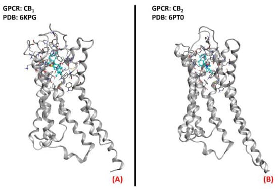 The structures of (A) the CB1 receptor (sourced from the Protein Data Bank, PDB code: 6KPG [], method: cryo-EM, resolution: 3.00 Å) and (B) the CB2 receptor (sourced from the Protein Data Bank, PDB code: 6PT0 [], method: cryo-EM, resolution: 3.20 Å). The images were created and rendered with MOE.