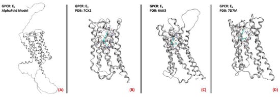Structure ofthe PGE2 receptors (A) EP1 (with no experimentally resolved structure available, the model sourced from the AlphaFold database is presented), (B) EP2 (sourced from the Protein Data Bank, PDB code: 7CX2 [], method: cryo-EM, resolution: 2.80 Å), (C) EP3 (sourced from the Protein Data Bank, PDB code: 6AK3 [], method: X-ray diffraction, resolution: 2.90 Å), and (D) EP4 (sourced from the Protein Data Bank, PDB code: 7D7M [], method: cryo-EM, resolution: 3.30 Å). All of the images were created and rendered with MOE.