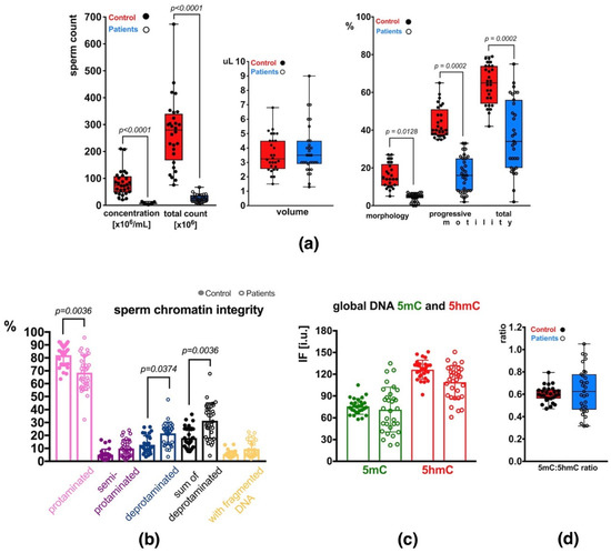 Sperm parameters observed in the control (C) and patient (P) groups. (a) Semen parameters; (b) Sperm chromatin integrity parameters (protamination—measured by aniline blue staining, and DNA fragmentation—measured by TUNEL assay); (c) Mean global DNA methylation (5mC) and hydroxymethylation (5hmC) status measured for the total, unfractionated sperm population; (d) 5mC:5hmC ratio in the unfractionated sperm population. Bars represent: (a)—upper and lower quartiles, whiskers: mean to max values and all measured points; (b–d)—mean values ± SD and all measured points. Statistical significance was considered at p < 0.05.