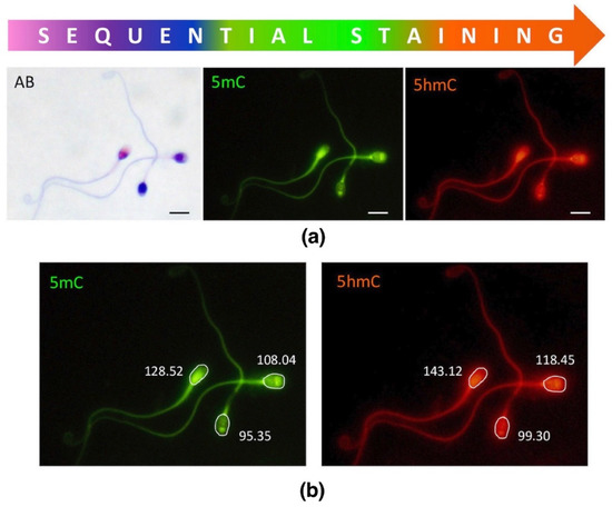 Epigenetic modifications are well-known reversible variations of the genome that determine the transcriptional status of the cell. Epimodifications are mostly prone to environmental factors and are heritable [1,2,3]. The primary epigenetic mechanisms involved in the regulation of the genome are DNA modifications (i.e., methylation), posttranslational modifications of histones (i.e., methylation, acetylation, ubiquitination, phosphorylation, etc.), and the activity of non-coding RNAs (nc-RNAs) [1,3,4,5,6,7]. The best-known epigenetic mechanism is the methylation and demethylation of the 5’ cytosine. Primarily, 5-methylocytosine (5mC) can be observed in CpG islands, where these moieties remain for the majority methylated (60–80%) [7]. DNA methylation remains stable in particular tissues, each type of which has its own pattern, but can be influenced by disease, pathological events, or age [7,8,9,10]. Cytosine methylation determines the genome-wide methylation pattern of DNA and the modification of histones, resulting in changes in chromatin configuration, playing a crucial role in gametic imprinting, gene silencing, chromosome X inactivation and protein conformational changes [1,3,4,6,7,11]. In the non-CpG context, DNA methylation has been observed in oocytes, embryonic stem cells and some types of brain cells. In contrast to methylation, hydroxymethylation (5hmC) is present at lower levels in particular tissues (0.1–0.8%), exhibiting increased values in tissues with high transcriptional activity (i.e., neurons) [7,12,13,14]. This epimark, a result of enzymatic oxidation of 5mC to 5-hydroxymethylocytosine (5hmC), is mostly observed in enhancers, promoter regions of genes, and other transcriptional regulatory elements [7,15]. In spermatozoa, which are transcriptionally inactive, the level of hydroxymethylation is approximately four times lower than in somatic cell types [16]. It has been suggested that 5hmC, together with Tet family enzymes (Ten-Eleven Translocation Proteins; Tet1, Tet2, Tet3), may supervise gene expression through regulation of methylation [12,14,16,17,18,19]. Thus, both 5mC and 5hmC seem to play important roles in proper genome function.
