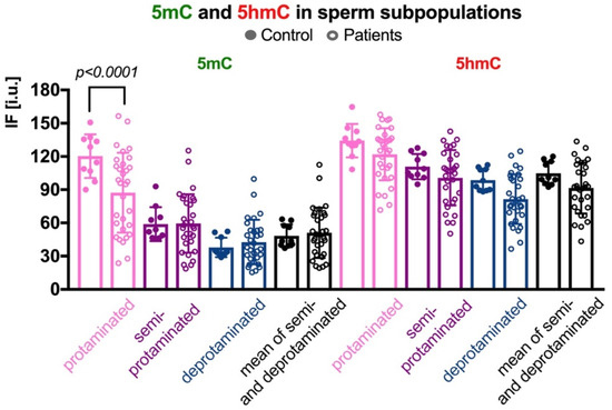 In three sperm subpopulations defined according to their protamination status, the mean control results for 5mC were as follows: (i) in the correctly protaminated subpopulation: 120.28 ± 19.65 i.u. (range: 90.01–150.67 i.u.; Table 2 and Table S3), which was statistically higher (p < 0.0001) than the mean result obtained for the group of patients: 87.29 ± 36.01 i.u. (range: 23.71–156.50 i.u.; Table 2 and Table S3, Figure 3); (ii) in the semiprotaminated subpopulation: mean C value was 58.92 ± 15.41 i.u. (range: 46.30–92.96 i.u.) and was statistically similar to the mean P value: 59.54 ± 26.34 i.u. (range: 18.80–125.35 i.u.); and (iii) in the deprotaminated sperm subpopulation: mean C value: 37.90 ± 8.84 i.u. (range: 28.91–52.25 i.u.) was also similar to the mean P value: 42.73 ± 20.11 i.u. (range: 16.78–99.75 i.u.).