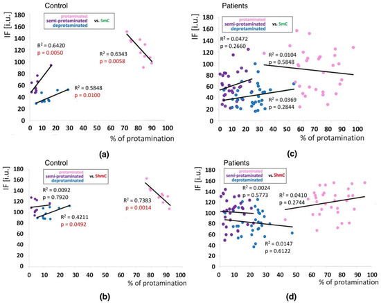 Correlations between methylation (5mC) and hydroxymethylation (5hmC) values (IF) vs. chromatin protamination status shown in three sperm subpopulations in the control and patient groups. (a): 5mC vs. protamination in the control group; (b): 5hmC vs. protamination in the control group; (c): 5mC vs. protamination in the patient group; (d): 5hmC vs. protamination in the patient group. Each point in the graph represents one case. For each male at least 50 spermatozoa per subpopulation were analysed. Subpopulations of spermatozoa are coded with following colour: pink for properly protaminated, purple for semi-protaminated, and blue for deprotaminated. Statistical significance was considered at p < 0.05.