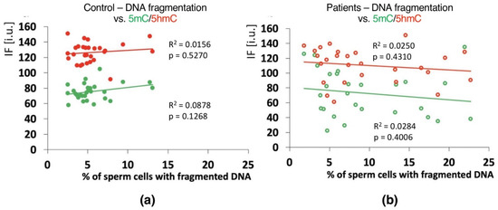 Correlations between global DNA methylation (5mC) and hydroxymethylation (5hmC) vs. mean sperm DNA fragmentation level in unfractionated sperm populations in the control C (a) and patient P (b) groups. Each point on the graph represents one case. For each male at least 1000 spermatozoa for TUNEL assay and 200 for IF epimark staining were examined. Statistical significance was considered at p < 0.05.