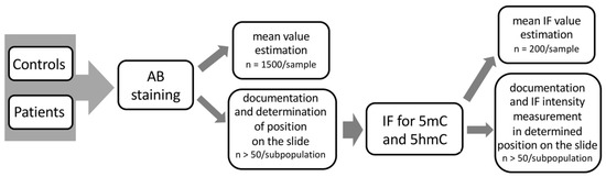 Immunofluorescence in situ was used to detect and measure the epimarks for global sperm DNA methylation (5mC) and hydroxymethylation (5hmC). This method has been validated previously when correlated to thin-layer chromatography (TLC) [42]. Specific antibodies conjugated to fluorochromes were applied: primary antibodies—mouse anti-5mC 1:200 (clone 33D3, cat no. MABE146, Merck), and rat anti-5hmC 1:1000 (cat no. ab106918, Abcam); secondary antibodies—goat anti-mouse-FITC 1:400 (cat no. F2012, Sigma-Aldrich), and goat anti-rat-AF594 1:800 (cat no. ab150160, Abcam). Antibodies were diluted in 1%BSA/1× PBST. Two negative controls were performed for each series of experiments: (i) without primary antibody to check the specificity of the binding, and (ii) without secondary antibody to check the possible fluorescence background level. First, samples with fixed sperm smears after AB staining and documentation were destained in 100% xylene reagent, followed by a series of washes in 1× PBST (pH 7.4, room temp., 5 min. each). Xylene washing is required for removal of any traces of oil immersion and aniline blue stain, and does not influence the immunofluorescent signals. Then, slides were incubated in 25 mM DTT/1 M Tris-HCl, pH 9.5, at room temperature for 20 min for slight decondensation of the chromatin. The degree of decondensation was fully controlled: only spermatozoa with an unaffected tail, preserved sperm head shape and a decondensed nucleus size no larger than 1.4-fold were selected. A series of washes in 1× PBST was followed by incubation in 6 N HCl. Then, blocking with 1% BSA/1× PBST for 30 min was performed. Next, overnight incubation with a mix of primary anti-m5C and anti-5hmC antibodies was performed in a humidified container at 37 °C. After double washing the samples with 1× PBST, secondary antibodies conjugated to selected fluorochromes (FITC or AF594; 60 min) were applied. Next, unconjugated antibodies were washed out (4× in 1× PBST, 5 min each). For the final detection, 20 mL of DAPI/Vectashield (Sigma-Aldrich) was added to the samples, and further analysis was performed. Approximately 200 sperm cells in each case (unfractionated into subpopulations; power calculation value = 132) were evaluated, followed by documentation and analysis of at least 50 sperm cells (power calculation value = 45) per chromatin status within the studied sperm subpopulation. Images of the IF results were acquired using a fluorescence microscope with a suitable filter set, and CellSense Dimension (Olympus) software was used (Olympus BX40, Japan; filters: DAPI/FITC/SpO/Triple; objectives: 10× and 100× with oil immersion; CCD camera). Measurements of the 5mC and 5hmC signal intensity (i.u.—intensity unit) were performed using CellSense Dimension software in-built measurement tools (‘Measure’ > ‘Intensity Profile’). The intensity of fluorescence (cell fluorescence, IF; international unit, i.u.) was calculated for each spermatozoon, including the integrated density, area of the sperm cell nucleus, and correction of the background fluorescence (measured in 5 areas outside of the spermatozoa containing only dark segments). The workflow scheme concerning the measurement of fluorescence is shown in Supplementary Figure S2. The total number of spermatozoa evaluated in the study amounted to approximately 171,100 counted (nondifferentiated) and 6150 cells documented in three analysed subpopulations.