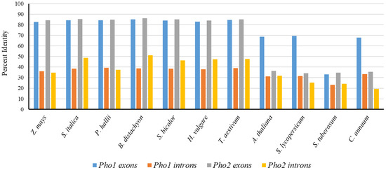 Each type of intron phase was found in the PHO1 of all monocots and dicots. However, only intron phase 0 and intron phase 2 were found in the PHO2 of all monocots and dicots (Figure 1). An identical intron phase pattern was observed in both PHO1 and the PHO2 (except the PHO1 of S. bicolor). For both PHO1 and PHO2 phases, phase 0 was the most dominant in all the examined species, ranging from 71.42–78.57% for PHO1 and 78.57–80% for PHO2. The average sequence similarity for exons in PHO1 was found to be higher in monocots (82.84–85.31%) than in dicots (33.18–69.50%). However, the average sequence similarity for introns was low in both monocots (36.15–39.40%) and dicots (23.23–33.47%) (Figure 2). For PHO2 exons, the similarity ranged from 84.50% to 86.17% in monocots and 19.21% to 31.75% in dicots; whereas, for introns, it ranged from 41.1% to 50.1% in monocots (except for S. italica where this was 72.8%) and 20% to 32.1% in dicots (Tables S1 and S2).