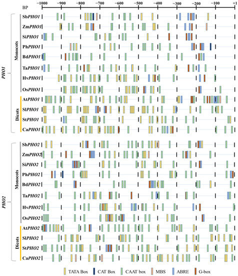 Representative figure showing regulatory elements identified in the 1 kb upstream region of PHO1 and PHO2. Different color bars represent the major regulatory elements. Symbols include: Sb, Sorghum bicolor; Zm, Zea mays; Si, Setaria italica; Ph, Panicum hallii; Bd, Brachypodium distachyon; Ta, Triticum aestivum; Hv, Hordeum vulgare; Os, Oryza sativa; At, Arabidopsis thaliana; Sl, Solanum lycopersicum; St, Solanum tuberosum; and Ca, Capsicum annuum.