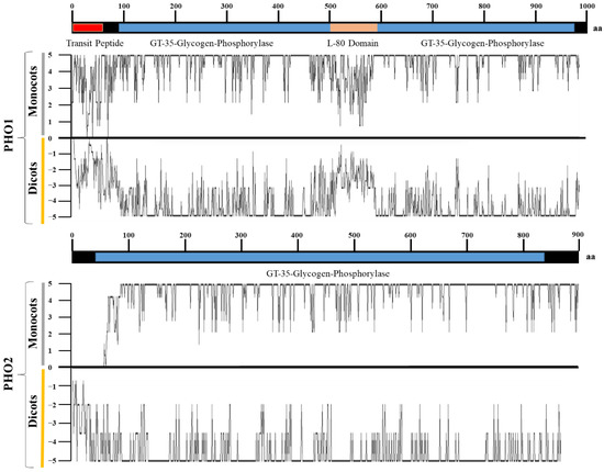 Among all monocots and dicots, PHO1 was longer in S. bicolor than in other species. PHO1 had two conserved domains (CDs): GT-35-Glycogen-Phosphorylase (97–950 aa) and a unique L80 domain (500–600 aa). The L80 domain was hyper-variable and predicted to consist of a PEST motif (a motif of negatively charged aa residues, which could act as a substrate for proteasomes) [31,32]. Similarly, the N-terminal (1–97 aa) was also hyper-variable, although the linker segments were conserved (Figure 4). Insertions, deletions, and mismatches were the main reasons for variations. Each of the PHO1 was found with the insertion of a variable transit peptide of up to 50 amino acids, which lacked in PHO2 except for the PHO2 of P. halli (Figure S3). The transit peptide contained several structural features common to transit peptides of chloroplast proteins, however, contained a surprisingly large number of histidine residues.