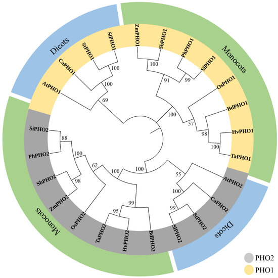 A phylogenetic tree constructed by the neighbor-joining method using the amino acid sequences of PHO1 and PHO2 to depict the relationship among monocots and dicots. The bootstrap value is calculated based on 1000 replications and displayed on each node. Symbols include: Sb, Sorghum bicolor; Zm, Zea mays; Si, Setaria italica; Ph, Panicum hallii; Bd, Brachypodium distachyon; Ta, Triticum aestivum; Hv, Hordeum vulgare; Os, Oryza sativa; At, Arabidopsis thaliana; Sl, Solanum lycopersicum; St, Solanum tuberosum; and Ca, Capsicum annuum. The branch length indicates the magnitude of genetic changes.