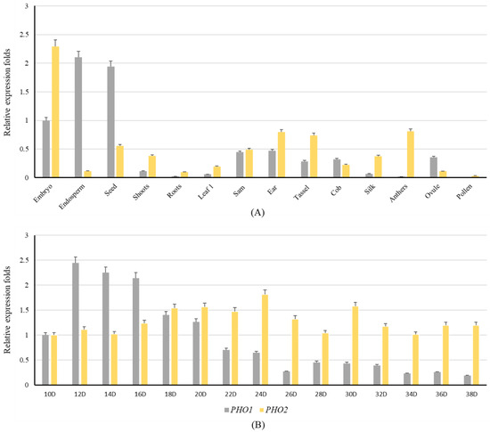 The results based on the microarray analysis showed that the expression pattern of PHO1 and PHO2 remained similar among all monocots and dicots. However, the expression pattern in the PHO1 of Z. mays was much more complex. In Z. mays, real-time quantitative polymerase chain reaction (RT-qPCR) analysis indicated that the expression level of PHO1 was the highest in the endosperm and the lowest in the anthers. Unlike PHO1, the expression level of PHO2 was the highest in the embryo and the lowest in the pollens. The results indicated that the expression level of PHO1 was low in the early stages of seed development, highest at 12 days after pollination, and then decreased until the end of the seed development. However, the expression level of PHO2 remained the same throughout the seed development and peaked at 24 DAF (Figure 7).