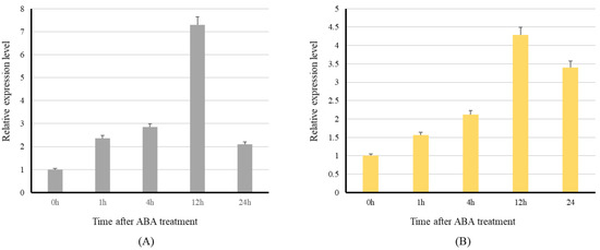 Expression level of the PHO1 and PHO2 of maize under ABA treatment. The 15 DAP middle seed of corn cob was used to treat with ABA in MS medium. Furthermore, 0 h indicates no ABA treatment and is used as a control. (A) Effect on PHO1 transcripts expression. (B) Effect on PHO2 transcripts expression.