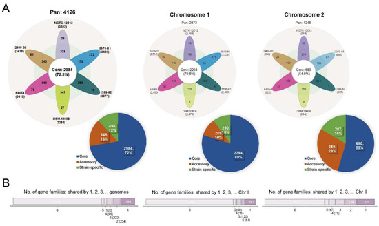 The pan-genome of the V. cincinnatiensis genome, Chr I, and Chr II. (A) Flower plots represent the number of the core, accessory, and strain-specific gene families shared by each strain. Pie charts represent the percentage of the core, accessory, and strain-specific gene families participating in the pan-genome of the V. cincinnatiensis genome, Chr I, and Chr II, respectively; (B) distribution of the gene families in the pan-genome of the V. cincinnatiensis genome, Chr I, and Chr II.