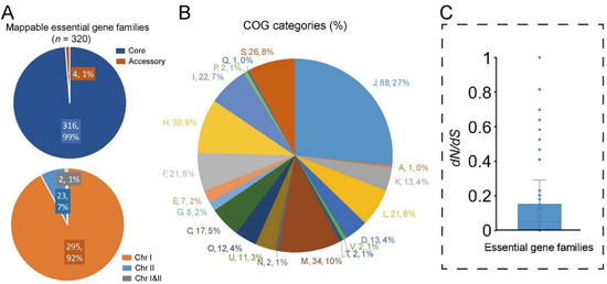 Analyses of the potential essential gene families in V. cincinnatiensis: (A) distribution of the potential essential gene families in pan-genome and chromosome location; (B) distribution of COG functional categories for the potential essential gene families; (C) the dN/dS rates of the potential essential gene families.