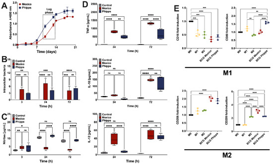 The bacterial growth and the immune characterization. For the growth curves of BCG strains: (A) the logarithmic (log) phase was determined at days 10–11 for both strains and is indicated in a dotted rectangle. The survival of the BCG strains in THP-1 macrophages (B) was tested at 3, 24 and 72 h postinfection. The nitric oxide production at progressive times by macrophages infected with the BCG strains, or in presence of the control, can be seen in (C). The concentrations of TNF-α, IL-10 and IL-12 in the supernatants of THP-1 macrophages infected with the BCG strains 24 h and 72 h postinfection, or of noninfected THP-1 cells, is shown in (D). The presence of the surface markers CD16 and CD80, or CD206 and CD209, related to M1 and M2 macrophages, respectively, is seen in (E). Data is expressed as means ± s.d. M0: M0 macrophages; M1: M1 macrophages; M2: M2 macrophages. * p < 0.05; ** p < 0.01; *** p < 0.001; **** p < 0.0001; ns: nonsignificant.