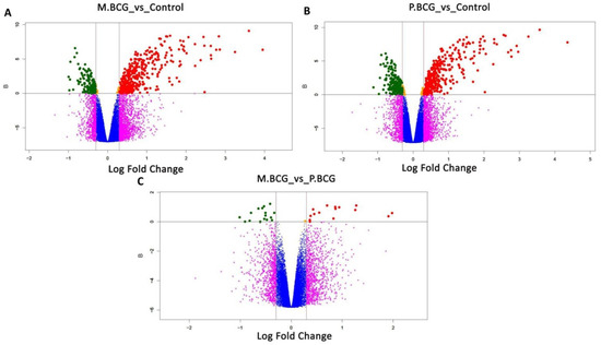 Volcano plot displaying differentially expressed genes in THP-1-derived macrophages: (A) Mexico BCG strain vs. control; (B) Phipps BCG strain vs. control; (C) Mexico BCG strain vs. Phipps BCG strain. B-statistic values are plotted against the log fold change (base 2). A B-statistic of zero corresponds to a 50–50 chance that the gene is differentially expressed (gray line). On the x axis, values outside the red lines represent log fold changes of ≥ 0.3 between M.BCG and P.BCG. Red and green dots represent over- and subexpressed genes, respectively.