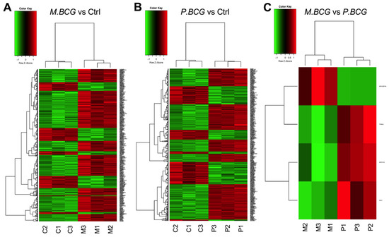Heatmap representation of differentially expressed genes in THP-1-derived macrophages: (A) M.BCG vs. Ctrl; (B) P.BCG vs. Ctrl; (C) M.BCG vs. P.BCG. Negative z-score indicates subexpressed genes (green), and positive z-score indicates overexpressed genes (red). Genes without significant expression are marked in black. The dendrogram on the left shows the relationship between the genes. M.BCG: Mycobacterium bovis Mexico; P.BCG: Mycobacterium bovis Phipps; Ctrl: control.
