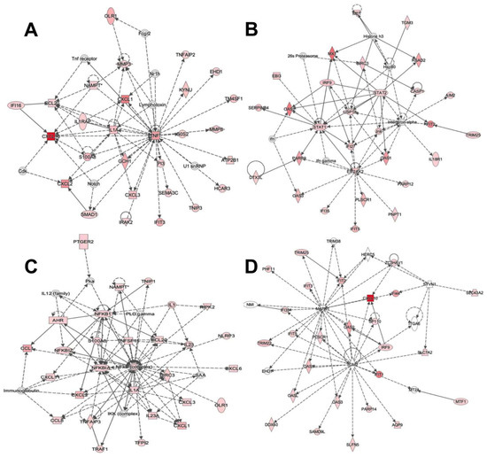 Networks induced by the BCG strains in THP-1-derived macrophages. Networks of functional: (A) dermatological diseases and conditions, cell-to-cell signaling and interaction, cellular movement; and (B) antimicrobial response, inflammatory response, cell signaling related to M.BCG vs. Ctrl. Network of functional: (C) inflammatory response, connective tissue disorders, inflammatory disease; and (D) antimicrobial response, inflammatory response, dermatological diseases and conditions related to P.BCG vs. Ctrl. Color codes: red, overexpressed; green, subexpressed. The color intensity indicates the degree of expression. Encoding form: rectangle—nuclear receptor ligand-dependent; oval—transcription regulator; rhombus—enzyme; circle—other.